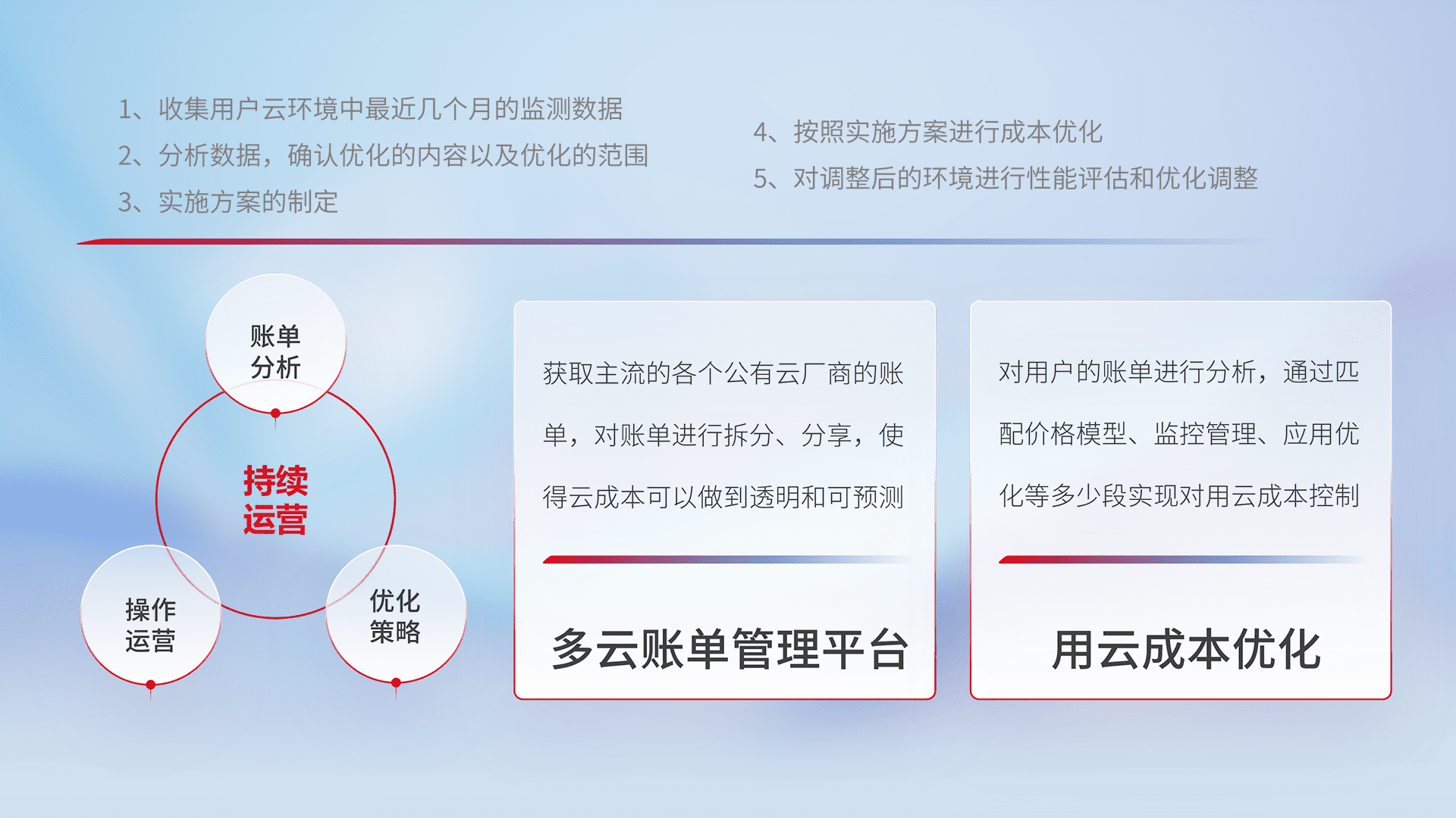 通过多云纳管,,以统一的资源数据模型把客户的云资源进行抽象和封装,,,进而实现对多云资源的统一操作,,,,保障云资源管理的可靠性、、、、稳定性与可用性。。。量身定制化运维内容,,配置、、、、开发运维、、、、补丁管理、、、备份、、、监控、、认证和访问管理、、、、审计和日常巡检等,,保障在用云过程中的可靠度,,,稳定度以及高可用率。。。。